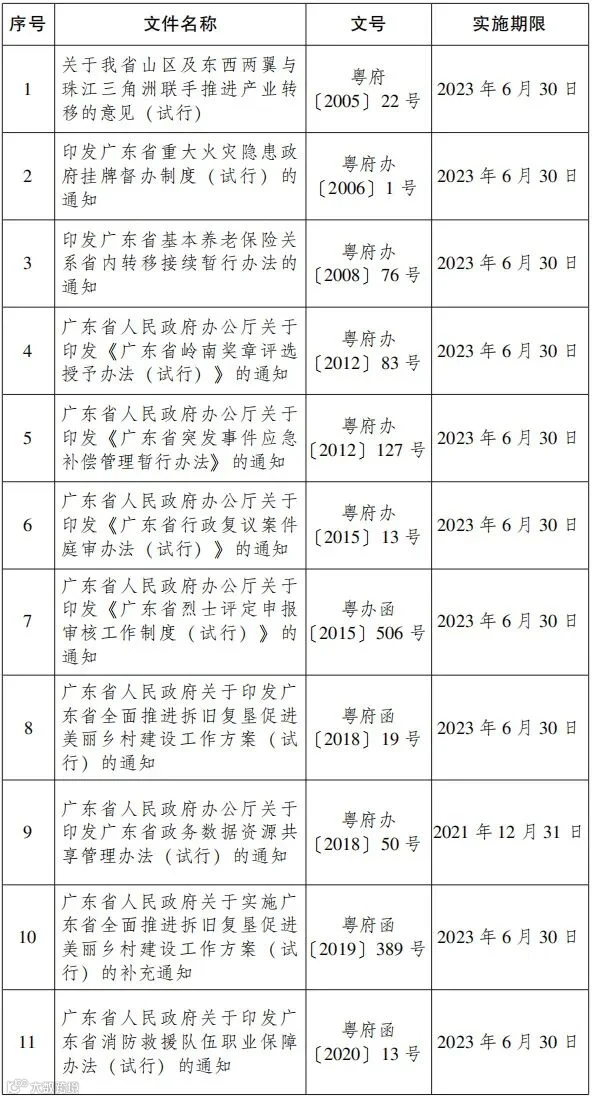 对《关于我省山区及东西两翼与珠江三角洲联手推进产业转移的意见(试行)》等11份规范性文件明确实施期限,实施期限届满且未按规定延长实施期限的,文件自动失效。
