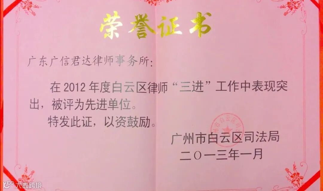 据统计,在开展一村(社区)一法律顾问工作过程中,广信君达先后荣获2012年度白云区律师“三进”工作先进单位、2012-2014年度天河区公益法律服务先进单位、2016年度白云区一村(社区)一法律顾问工作先进集体、全省律师行业参与村(社区)法律顾问工作先进党组织、2016-2017年度参与村(社区)法律顾问工作先进党组织,总计有25人次获得省市区级相关表彰。