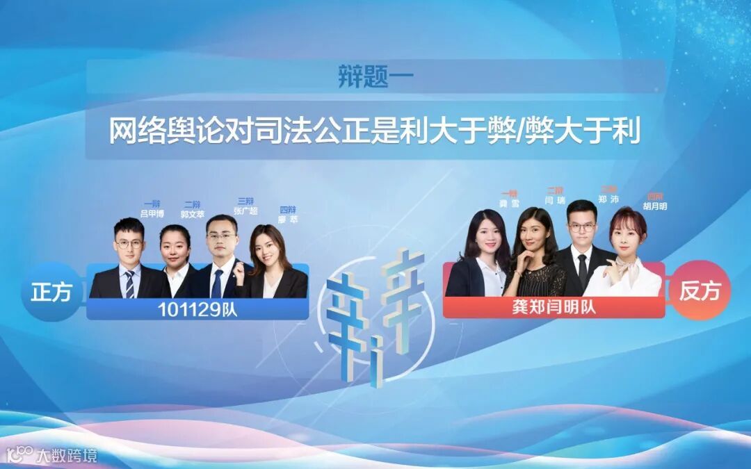 正反双方首先以高度概括的语言陈述各方观点,正方认为,网络舆论的广泛监督作用促进司法更加公开、透明、高效,促进了程序正义的实现;网络舆论反映民意,有助于司法行为法律效果与社会效果的统一,促进了实体正义的实现;网络舆论对新问题及时讨论,促进了法律适用标准的修订,促进个案公正转化为类案公正,司法公正内容与时俱进。虽然网络舆论也有不足,但网络舆论也被监管,其发展方向是向好的,所以对司法公正是利大于弊的。反方辩手则抓住对方漏洞,步步紧逼,强调网络舆论对司法公正并非利大于弊,认为网络舆论欠缺专业性,具有盲从性,易被操控等,并以高中及以下学历网民占比为80.2%、于某辱母案中网民对于某进行全民审判并认定其无罪为例,予以证明。整场比赛中,辩手们思维敏捷、论证严谨,凭借犀利的语言和高超的答辩能力为观众们奉上一场精彩的唇枪舌战。