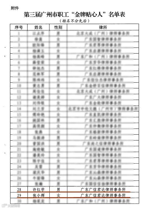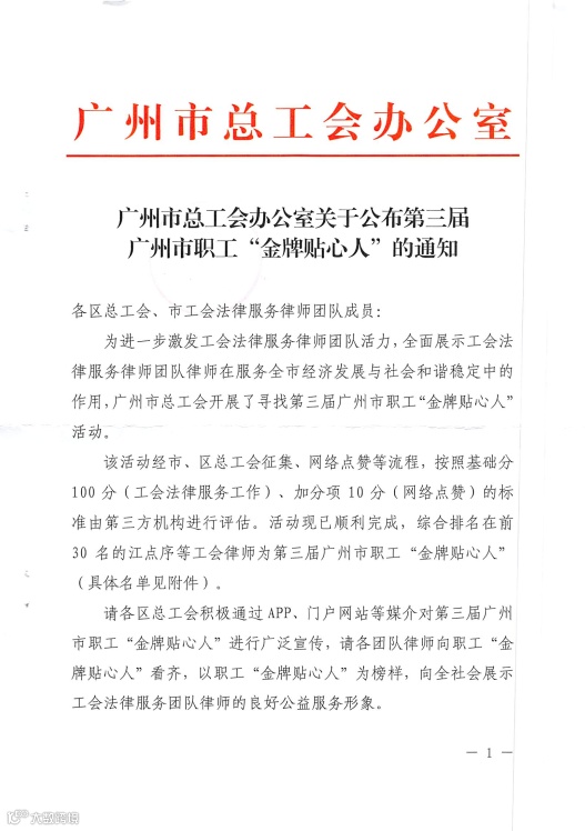 为进一步发挥广州市总工会法律服务律师团队律师在维护社会和谐稳定中的作用,激发团队活力,广州市总工会开展了寻找第三届广州市职工“金牌贴心人”活动。经过各程序审核,于近日公布评选结果,广信君达律师事务所合伙人律师许红学、专职律师张小辉在众多参选人中脱颖而出,荣获第三届广州市职工“金牌贴心人”称号。