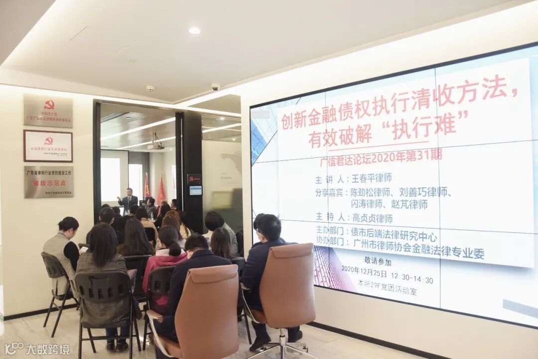 2020年12月25日,广信君达律师事务论坛之业务沙龙2020年第31期——“创新金融债权执行清收方法,有效破解‘执行难’”成功举办,由本所债市后端法律研究中心(简称“中心”)主办,市律协金融法律业务专业委员会协办。