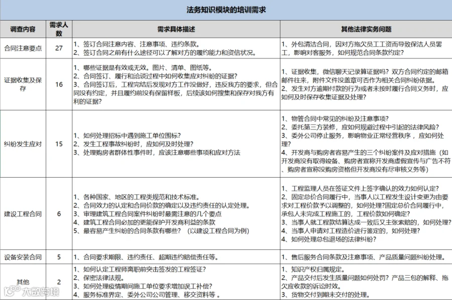 (图:培训需求涵盖建设工程合同、商品房买卖合同、物业合同在内7个板块的实务问题,共计34个问题,黎国贵律师结合法条以及实务,一一予以解答)