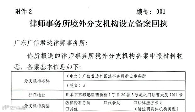 我所东京分所获得广东省司法厅出具的001编号的《律师事务所境外分支机构设立备案回执》。