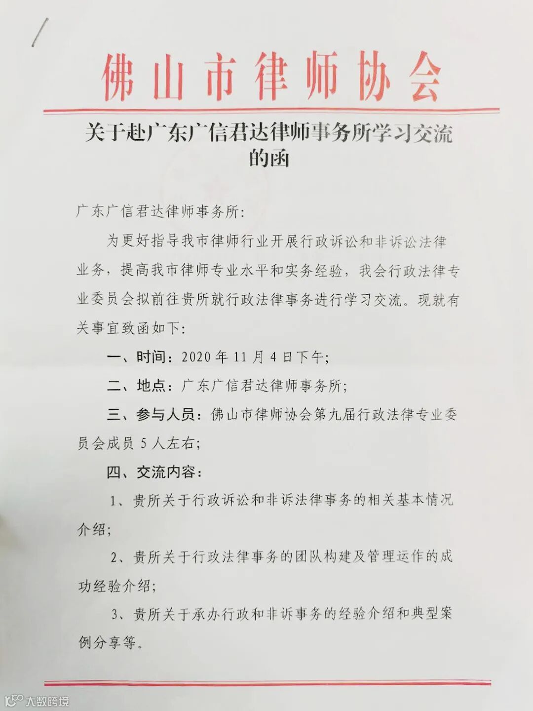 2020年11月4日下午,佛山市律协行政法律专业委员会(简称“佛山律协行政专委”)主任魏艳一行与广东盈隆律师事务所(简称“盈隆所”)政府法事务部主任、知名法律时评人王学堂律师莅临广信君达律师事务所共同举办行政法业务交流活动。佛山律协行政专委一行还包括副主任陈志劲,秘书长黄震,委员何敏、张婉媚等。本所高级合伙人、合伙人会议联席主席、党委副书记邓传远,高级合伙人、管委会主任苏东海,合伙人、党委委员、管委会秘书长张成勇,合伙人、执委会委员张蓉,合伙人林川、李东伦共同出席。君行团队成员梁广涛、叶丽燕律师、李大为律师助理及行政法业务团队陈明圣律师、刘波律师助理合共30余人参加。
