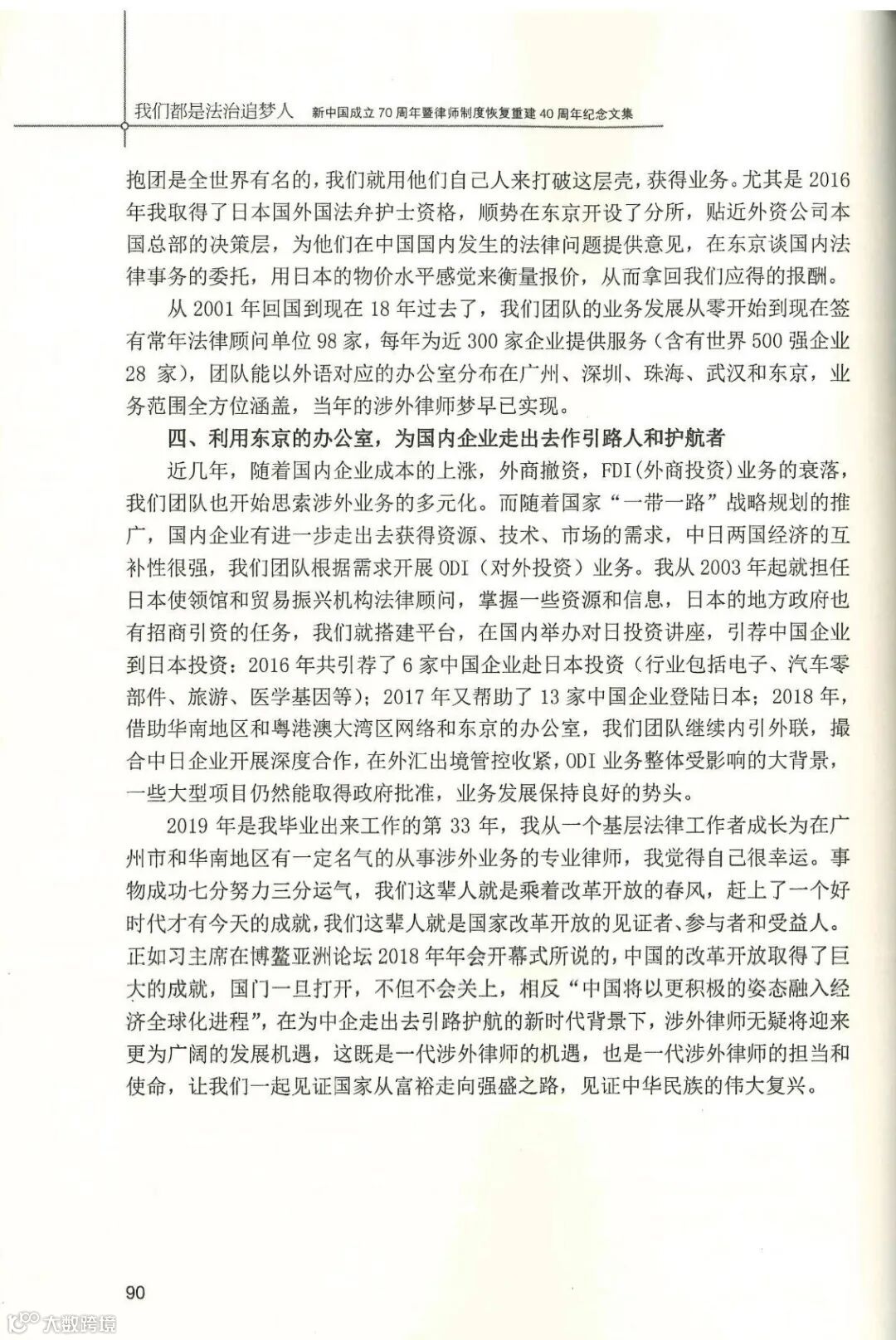 作为全面推进依法治国的重要力量,广州律师在促进经济发展、维护社会公平正义、推动社会治理能力现代化等方面都发挥着重要作用,已然成为参政议政的重要发声者,维护社会稳定的“润滑剂”,服务政府、助推营商环境发展的有力推动者,也涌现出一批批为实现中国梦的法治追梦人。2020年3月,广州市律协通过向我市广大律师征集个人执业奋斗经历,最终选编了38篇文章,汇编成新中国成立70周年暨律师制度恢复40周年纪念文集《我们都是法治追梦人》。