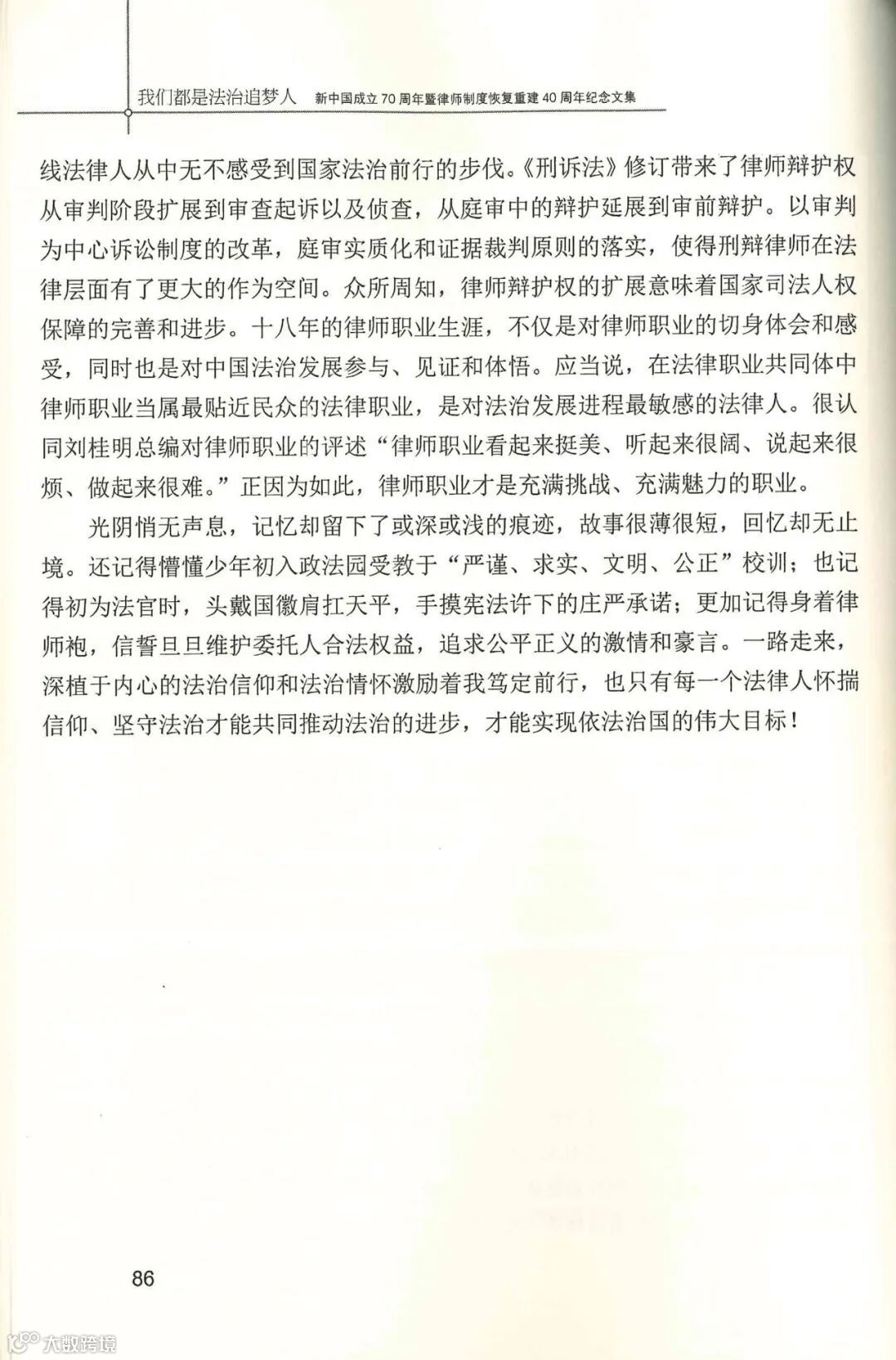 作为全面推进依法治国的重要力量,广州律师在促进经济发展、维护社会公平正义、推动社会治理能力现代化等方面都发挥着重要作用,已然成为参政议政的重要发声者,维护社会稳定的“润滑剂”,服务政府、助推营商环境发展的有力推动者,也涌现出一批批为实现中国梦的法治追梦人。2020年3月,广州市律协通过向我市广大律师征集个人执业奋斗经历,最终选编了38篇文章,汇编成新中国成立70周年暨律师制度恢复40周年纪念文集《我们都是法治追梦人》。