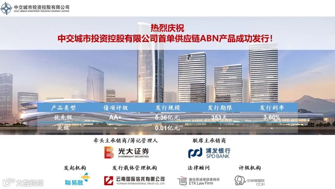 2020年9月21日,联捷保理2020年度第一期中交城投供应链应付账款资产支持票据成功发行,发行规模为5.37亿元人民币。其中,优先级发行规模为5.36亿元,发行利率为3.60%,次级发行规模为0.01亿元,发行期限为353日。后续将择机在注册额度内分期发行。