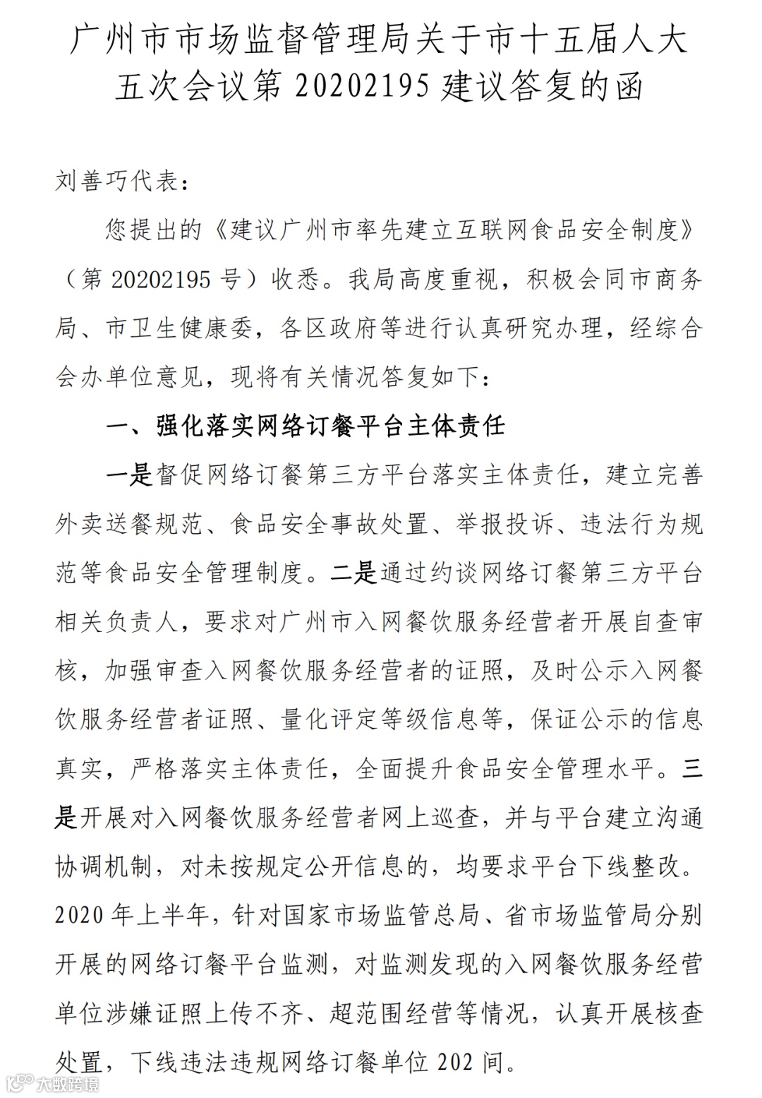 本次走访交流活动中,市场监管局相关处室的负责人表示,刘善巧律师提出的建议具有前瞻性、必要性,十分赞同为迅猛增长的的互联网订、送餐业提出制度、规范管理的建议,并强调该议案是对政府职能部门的帮助与支持,同时表示目前已在全市餐饮单位范围内积极开展“明厨亮灶”工作,引导餐饮经营单位“上线亮相”,建立全新的“互联网+数字化”监督平台,将进一步细化把工作做得更好。并指出该议案也是响应习总书记广东视察重要讲话精神的举措,旧城市焕发新活力,先试先行,率先把广州市创建为国家的食品安全示范城市打下坚实的基础。