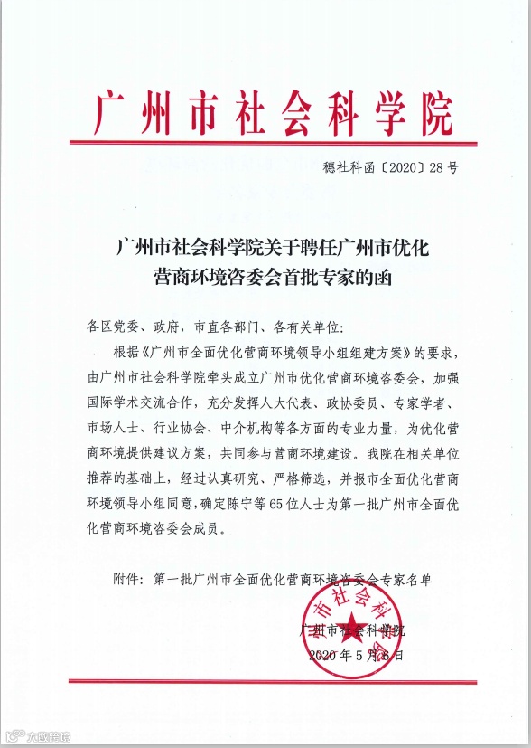 正式受聘为首批广州市全面优化营商环境咨委会专家学者组成员之一