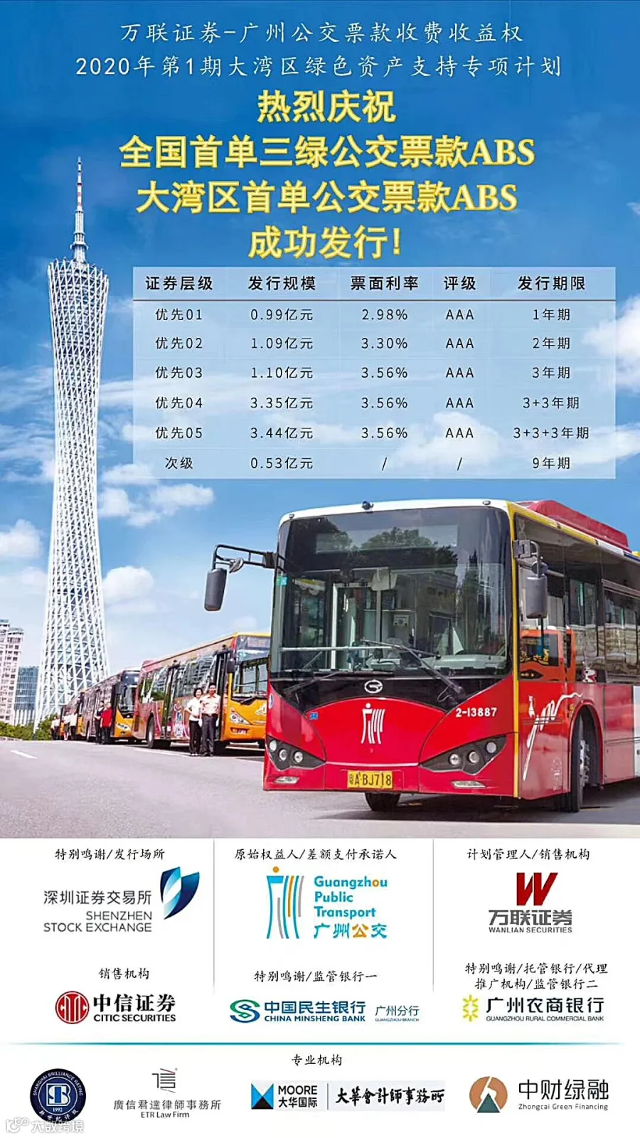 广信君达律师事务所担任本专项计划的专项法律顾问,由本所高级合伙人张雪芳律师,邱艳玲律师、苏婉琪律师、施瑞涛实习律师、黄喻诚实习律师等共同组成项目工作组,协助公交集团完成原始权益人、基础资产等法律尽职调查工作;与万联证券、中信证券、新世纪评级、大华会计所、中财绿融等中介机构保持紧密沟通;与各合作机构走访有关部门沟通协调工作,为融资方案的实施与落地提供专业法律建议;积极参与并配合管理人完成交易结构设计、交易文件起草;根据证监会、深交所的要求出具专项《法律意见书》,得到公交集团及各中介机构的一致好评。