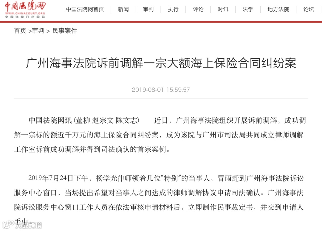 此外,杨学光律师于2019年7月份在广州海事法院组织下,成功调解一宗标的额近千万元的海上保险合同纠纷案,成为广州海事法院与广州市司法局共同成立的律师调解工作室诉前调解成功并得到司法确认的首宗案例。本次成功调解反响较大,受到全国法院系统和新闻媒体的广泛关注,中国法院网、广州海事法院、今日头条、中国改革网、南方网、新浪网、羊城派等均作出深度报道。