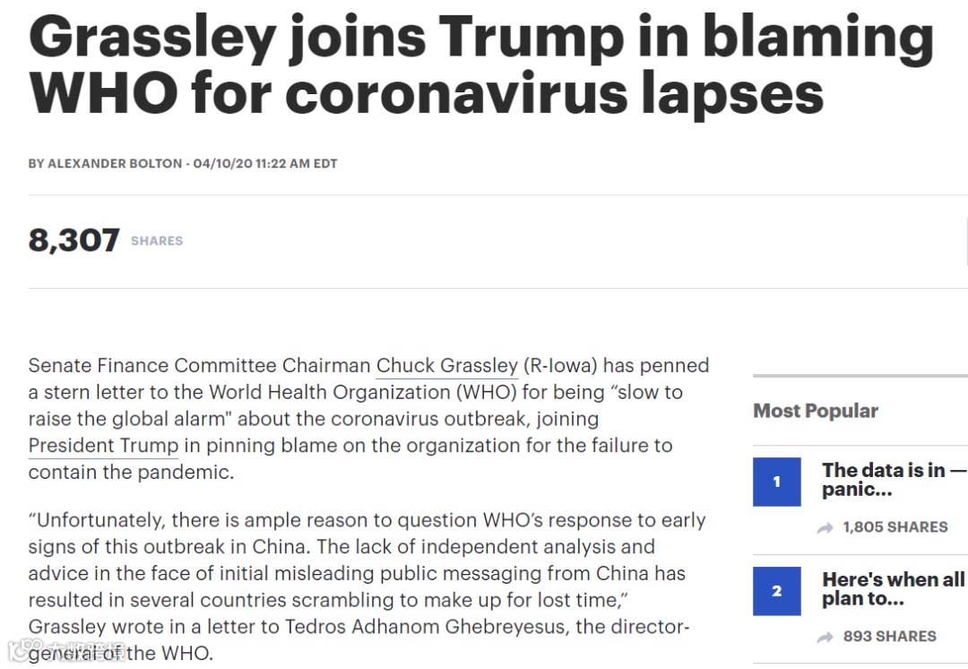 2. 根据2020年4月10日的媒体报道,美国参议院财政委员会主席查克·格拉斯利(Chuck Grassley)也给世卫组织总干事谭德塞写信,质疑世卫组织对于中国早期爆发疫情迹象的反应,指责中国提供的数据不准确。他认为,世卫组织的责任是独立运作,他怀疑中国对于世卫组织的反应施加了政治影响。