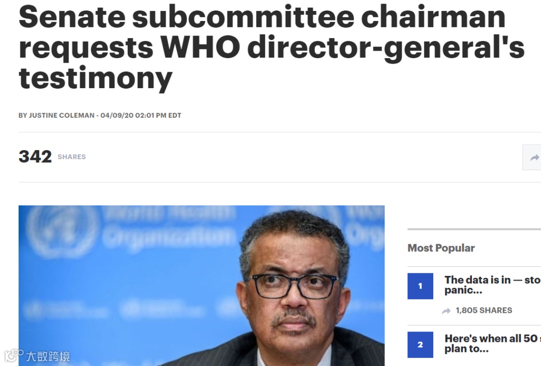 根据网络媒体和自媒体的报道:“4月13日,美国参议院国土安全委员会主席约翰逊宣布,将有调查小组对包括新冠病毒起源、美国政府的回应以及世界卫生组织(简称“世卫组织”)的角色等进行调查。4月14日,调查工作组组长托德和7名议员发函给谭德塞,要求配合调查。信中说,美国纳税人为世界卫生组织提供资金,调查小组有责任确保这些纳税人的钱得到合理使用……”