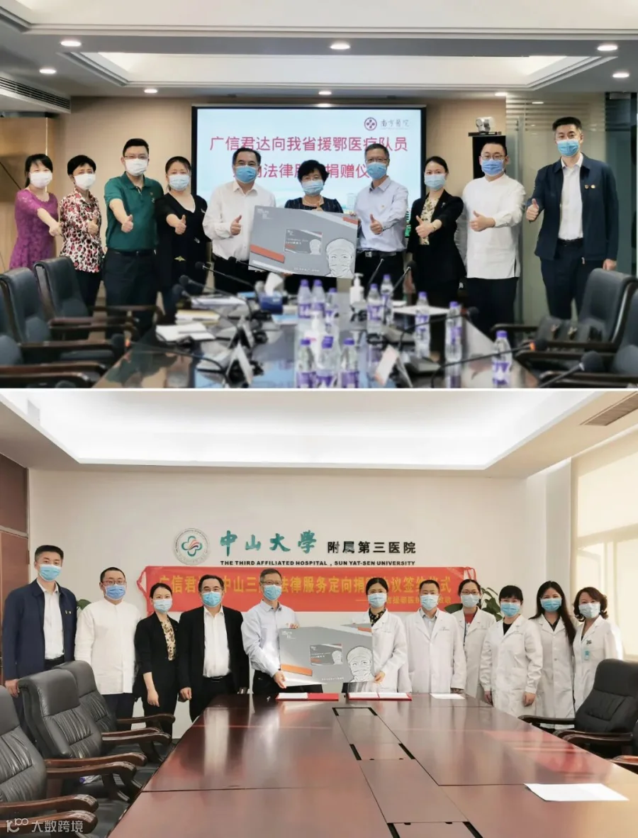 4月8日,为表达对广东援鄂医护人员、公安干警无私奉献的感恩之情,广信君达党委与事务所联合举办“感恩·尽责”承诺书签字仪式。律所设立专项资金,资金来源于律所自有资金和律师及全体员工的捐赠,以发放补贴的形式倡导律师为上述人员提供两年免费法律咨询、民事诉讼代理法律服务。4月28日,本所与南方医科大学南方医院、中山大学附属第三医院先后举办法律服务定向捐赠仪式,发放援鄂医护人员法律服务卡。