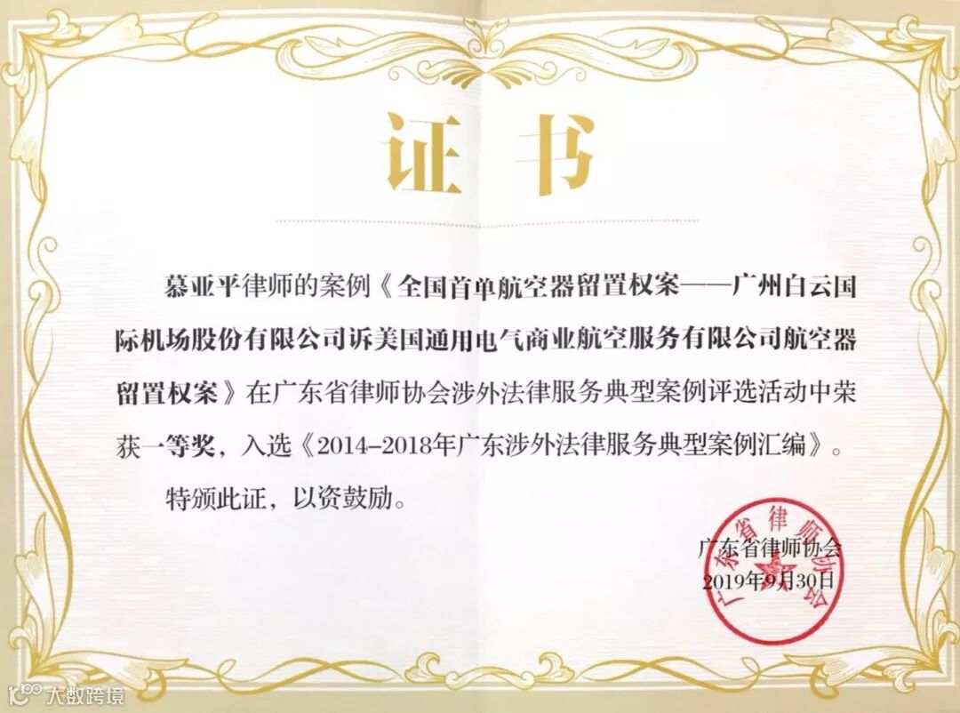 此次评奖中,广东广信君达律师事务所高级合伙人慕亚平律师及合伙人周莲律师参与代理的案件《全国首单航空器留置权案——广州白云国际机场股份有限公司诉美国通用电气商业航空服务有限公司航空器留置权案》荣获一等奖,并收录至省律协、广东省“一带一路”法律服务研究中心编印的《涉外法律服务典型案例汇编》。