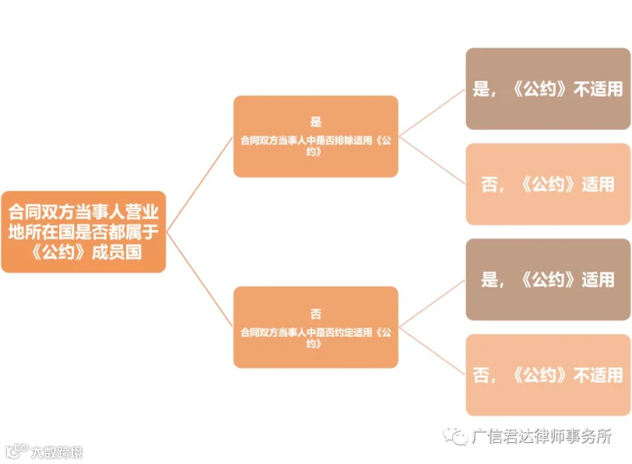 根据《公约》第一条和第六条,如果当事人营业地所在国都是《公约》成员国,除非双方约定排除适用《公约》,否则该国际货物买卖合同应适用《公约》。企业可以简单参考“合同适用《公约》自查图”。