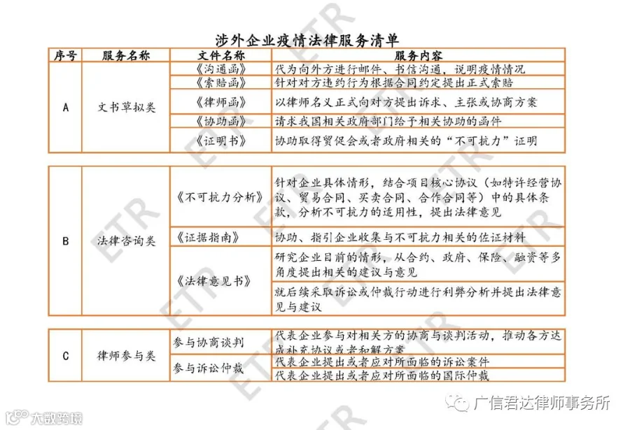 广信君达律师事务所闪涛涉外法律服务团队长期专注涉外法律服务,擅长中英双语服务,针对此次疫情,结合企业自身需求,闪涛涉外法律服务团队专门制作的一份涉外企业疫情法律服务清单,用以协助涉外企业尽早采取积极主动的应对措施。闪涛涉外法律服务团队建议,尽量走协商、和解的路径解决当前因疫情造成的商业纠纷,但同时也应当做好相关诉讼或仲裁的准备。