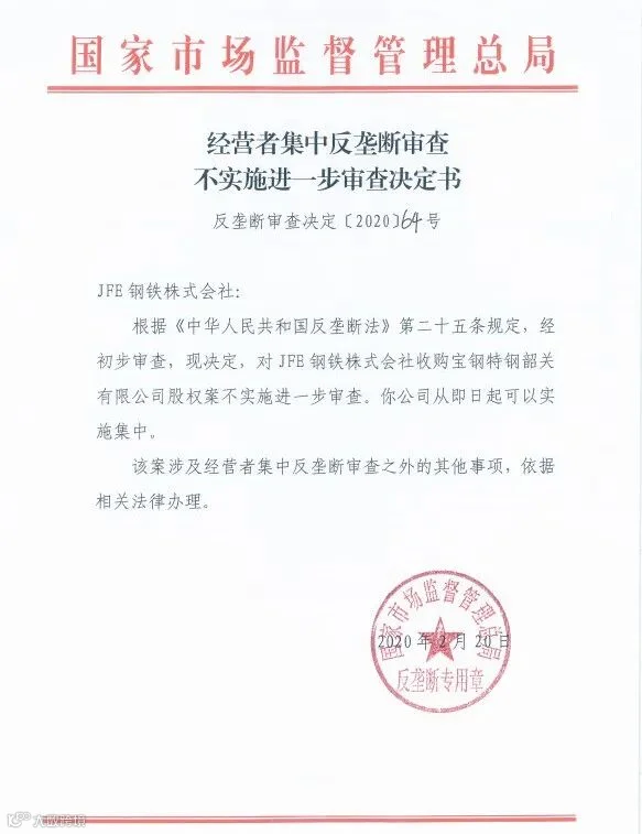 2020年2月20日,国家市场监督管理总局反垄断局出具《不实施进一步审查决定书》(反垄断审查决定〔2020〕64号),正式批准本次经营者集中的实施。至此,广信君达该项目专项法律服务组成功助力韶钢松山、JFE完成本次交易反垄断审查申报工作,为推进宝武集团、韶钢松山提高竞争力和实现特钢体系的突破发展贡献重要力量。