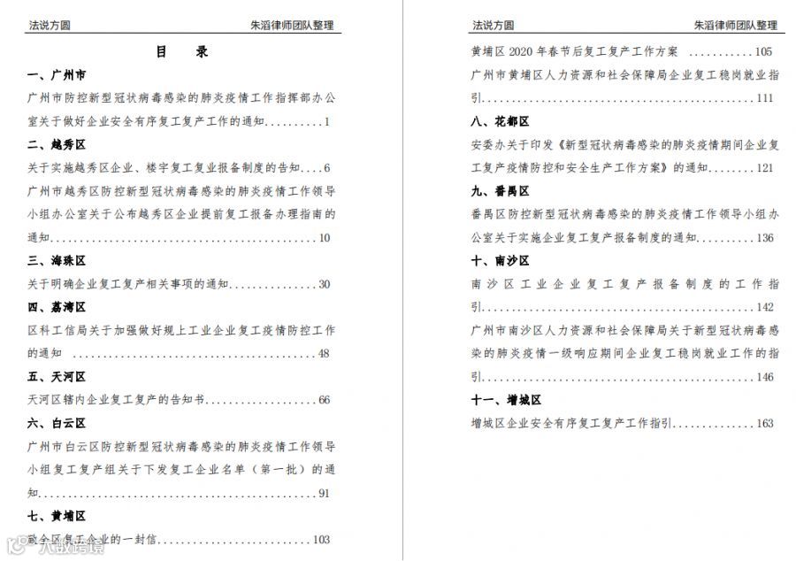 三、《广州市及各区复工复产通知汇总》内容暂根据发表日之前(不包括发表之日)出台现行有效的法律法规及政策,若后续政府、司法部门等针对本次疫情发布最新通知或意见的,本律师团队将对相关内容予以及时更新和补充。