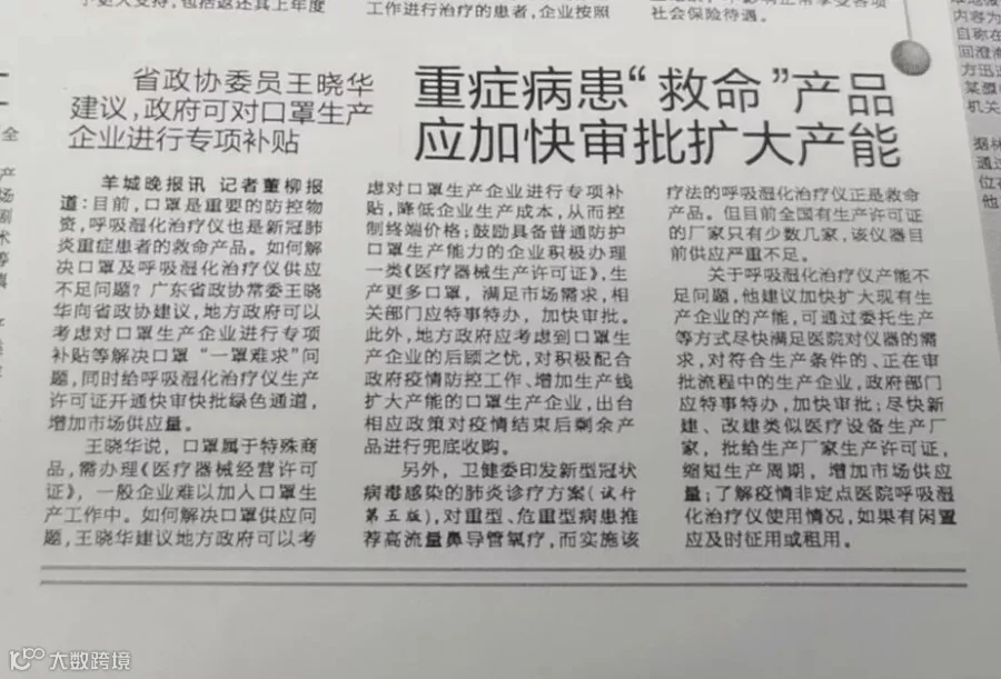 2020年2月7日,我所主任、高级合伙人王晓华律师,向省政协提出紧急提案和建议——《关于解决口罩及呼吸湿化治疗仪供应不足问题的紧急建议》。2月8日,羊城晚报、羊城派做了报道,反响热烈。