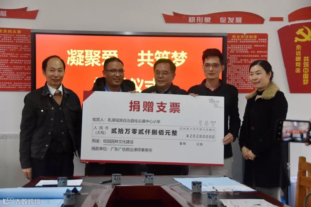 乳源瑶族自治县桂头镇中心小学创办于1930年,是一所办学历史悠久、文化底蕴深厚的乡镇小学,全校现有少数民族学生及汉族学生共2473名。此次捐资助学,是广信君达自发面向全所律师,自愿为桂头镇中心小学募集善款,用于校园文化环境建设。自12月20日发出倡议书至捐资助学仪式当日,得到了本所合伙人及律师的广泛关注,全所共募集善款人民币202800元整。其中,王晓华、孙俊杰、夏志林、梁伟宁、徐梦婷、刘文祯等律师积极响应,捐款较多。合伙人、第六党支部书记张雪芳律师自愿为捐资助学仪式往返两日产生的食宿费用等提供全额赞助。