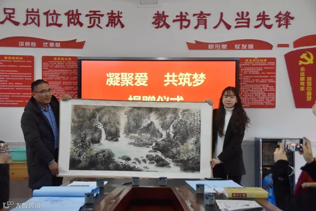 随后,广州市文化广电旅游局(文物局)副巡视员、广东省美协会员、知名国画家温朝晖先生向桂头镇中心小学捐赠国画一幅。温朝晖先生表示,很荣幸参与捐资助学活动,此画内容为英德山水风光,他寄语粤北地区的经济文化教育越来越好。