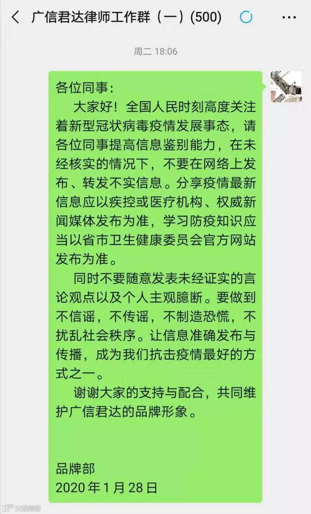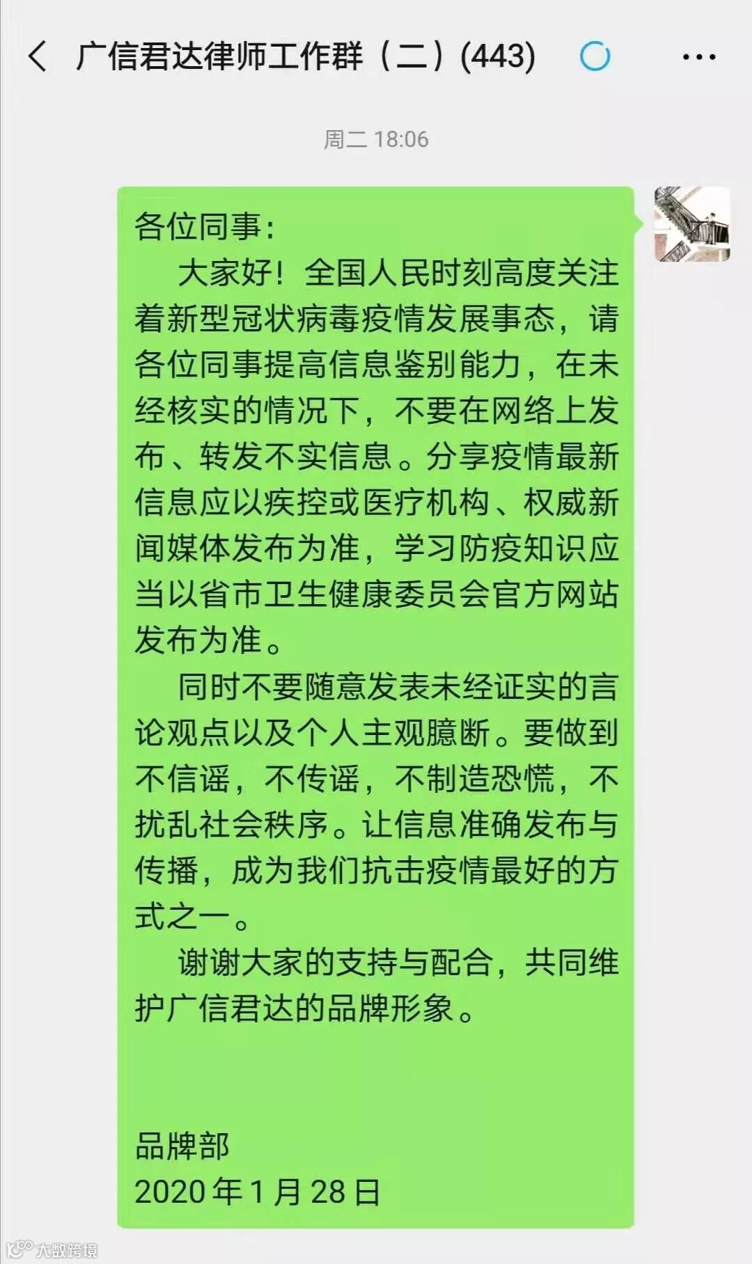 新型冠状病毒疫情牵动着全国人民的心,为切实保障您及本所员工的健康安全,避免疫情传播与扩散,配合国家打赢疫情防控阻击战,现将广东广信君达律师事务所复工安排公布如下: