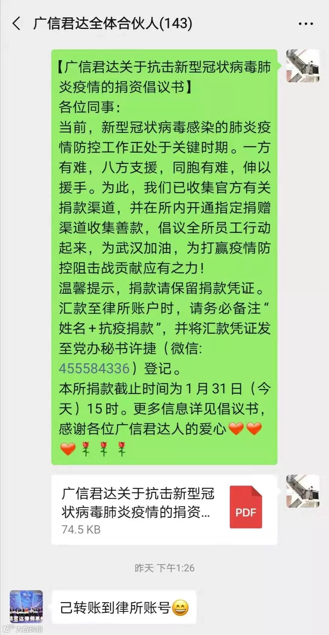 发起抗击新型冠状病毒肺炎疫情的捐款倡议书,本所员工通过各渠道筹集善款20万元。