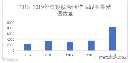 从上图可知,在2015-2019年期间,合同诈骗罪案件的数量逐年上升,其中2019年高达8472件,是2018年的2倍多,五年间合同诈骗罪案件在全国平均每天十起以上,可以说合同诈骗案件是司法实践中高发的刑事案件之一。