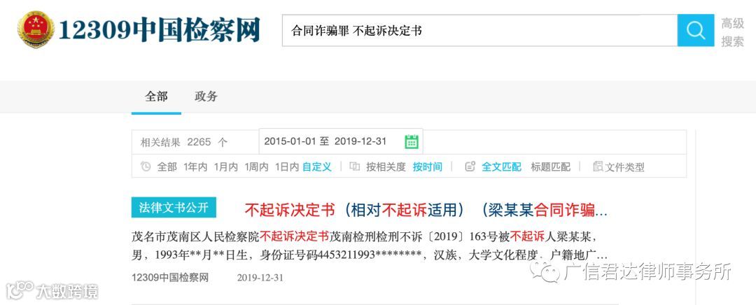 笔者在人民检察院案件信息公开网上进行检索,在2015-2019五年期间,共检索到20821份合同诈骗罪案件的起诉书和不起诉决定书,其中起诉书为18556份,不起诉决定书为2265份,不起诉率为10.88%。