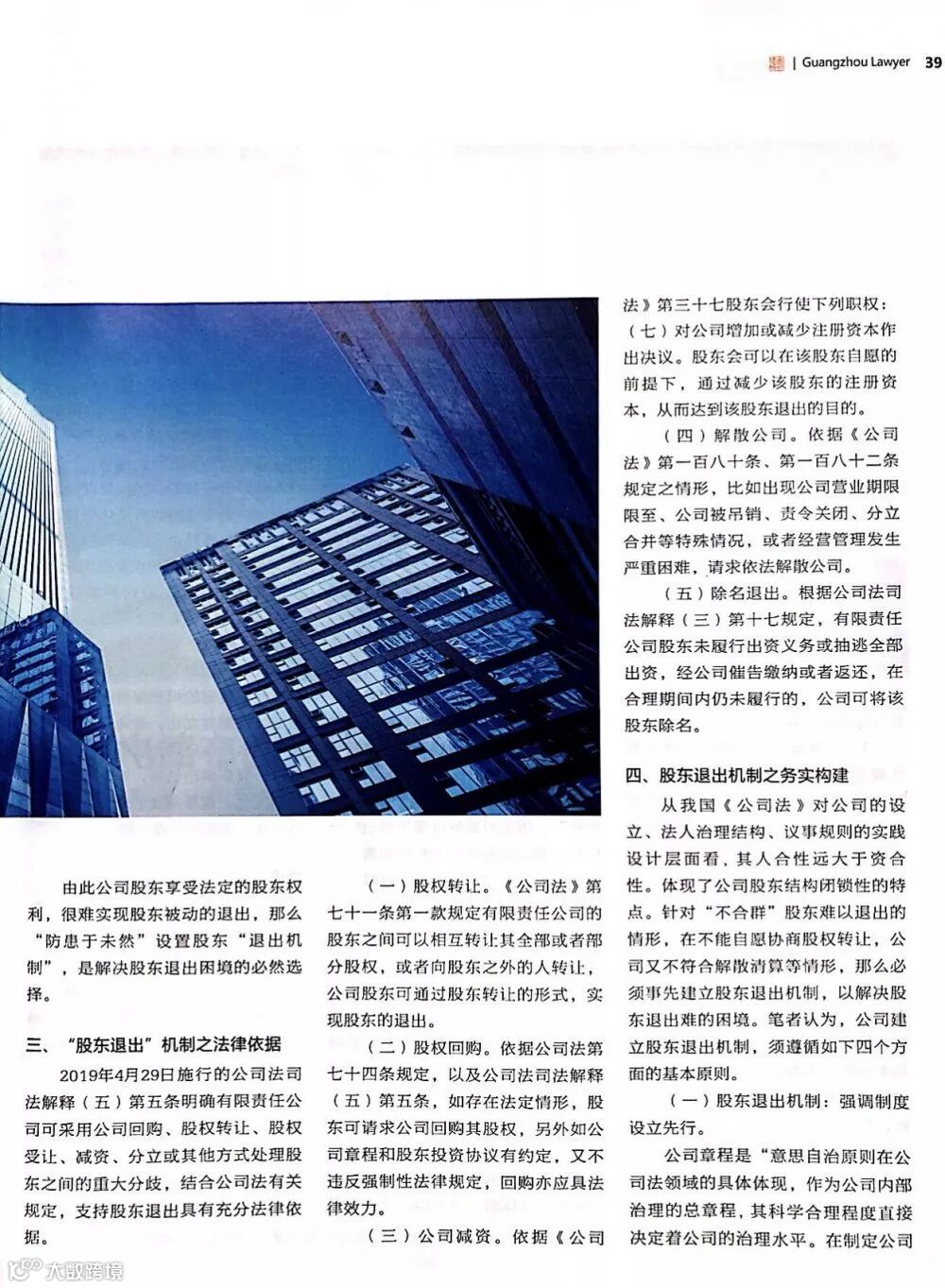 有限责任公司强人合性的特点,决定了股东之间合作关系如遭破坏,维持原有的股东结构不但会导致内部治理困难,甚至可能引发更深层次的价值冲突,既不利于股东利益的保护,也不利于公司的健康发展。现行《公司法》框架下的股东法定退出事由,门槛较高,股东“迈出去”的难度更高。完善公司内部治理中的股东退出机制,显然不能仅凭“法定退出”,同时还要善用《公司法》创设的“意思自治”空间。近日,广东广信君达律师事务所合伙人蒋修贤律师结合个人理论研究和实务工作经验,撰文《有限责任公司股东退出机制之务实建构》,系统探讨了如何通过“法定”与“意定”的结合,创设更为科学合理的股东退出路径,在完善公司内部治理的同时,提升股东投资价值。