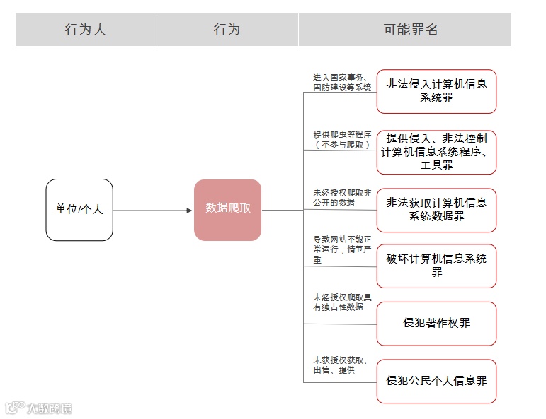 根据实际中不同情形,我们归纳了数据爬取可能直接涉及的刑事责任,见下图: