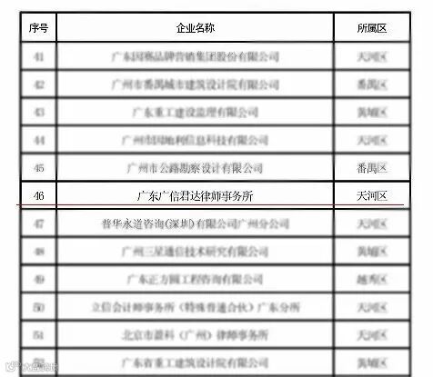 近日,根据《广州市人民政府办公厅关于加快发展高端专业服务业的意见》(穗府办规〔2018〕22号),通过组织申报、初审、复审、公示等程序,经市人民政府同意,广州市发展改革委员会公布了2018年度广州市高端专业服务业重点企业名单,广东广信君达律师事务所成功入选。