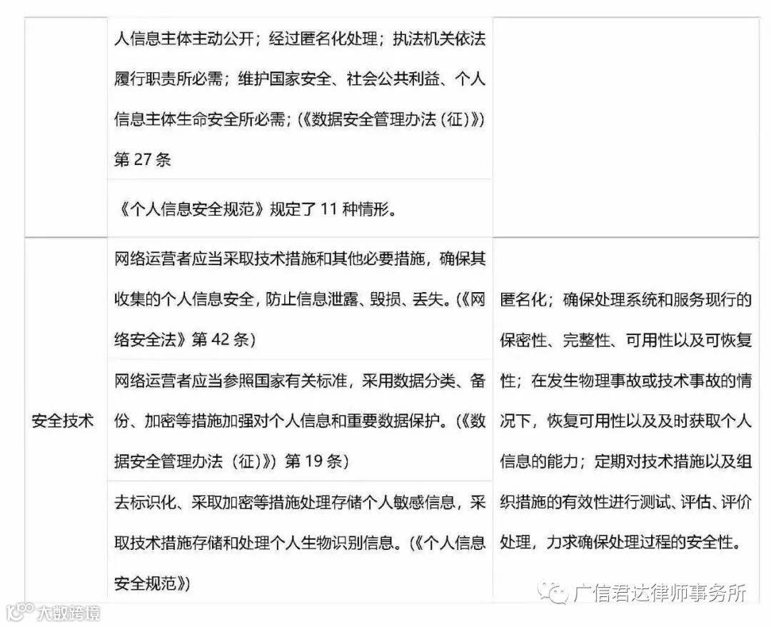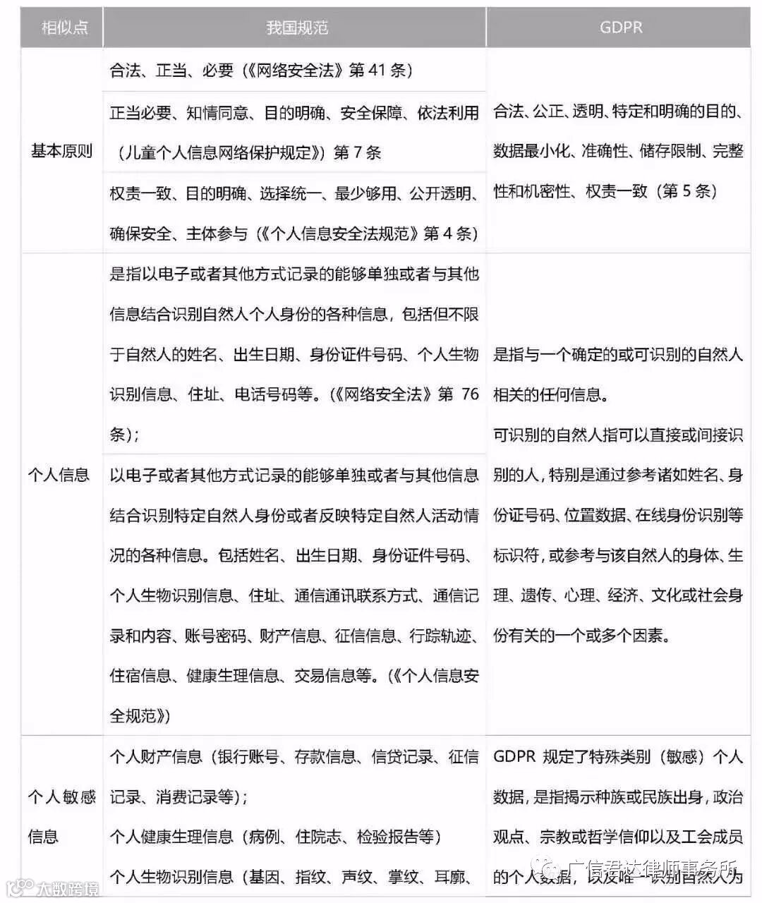 GDPR出台和我国掀起的立法高潮时间点都在大数据和人工智能快速发展的大背景下,经过梳理,我国规范与GDPR规则在基础规则方面大体一致: