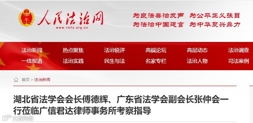 2019年10月21日下午,湖北省法学会会长傅德辉、省政法委副书记刘太平一行六人莅临广东广信君达律师事务所考察指导,广东省法学会副会长张仲会一行陪同。广信君达高级合伙人王晓华律师、陈伟雄律师、邓传远律师、刘善巧律师等热情接待。