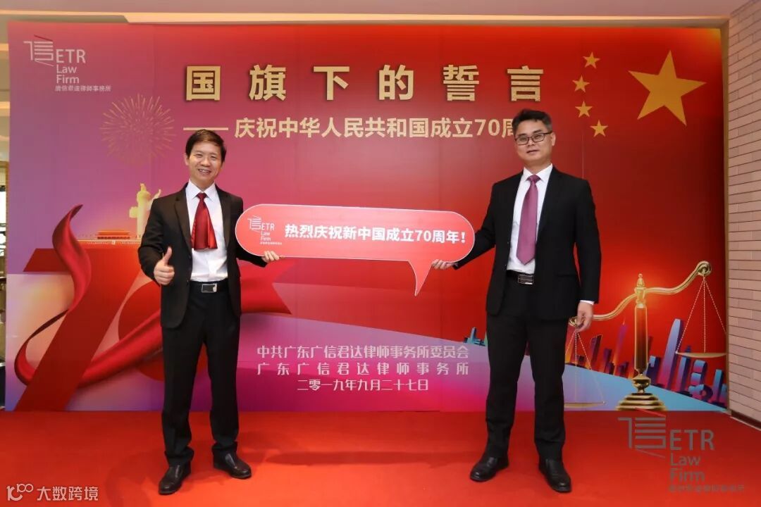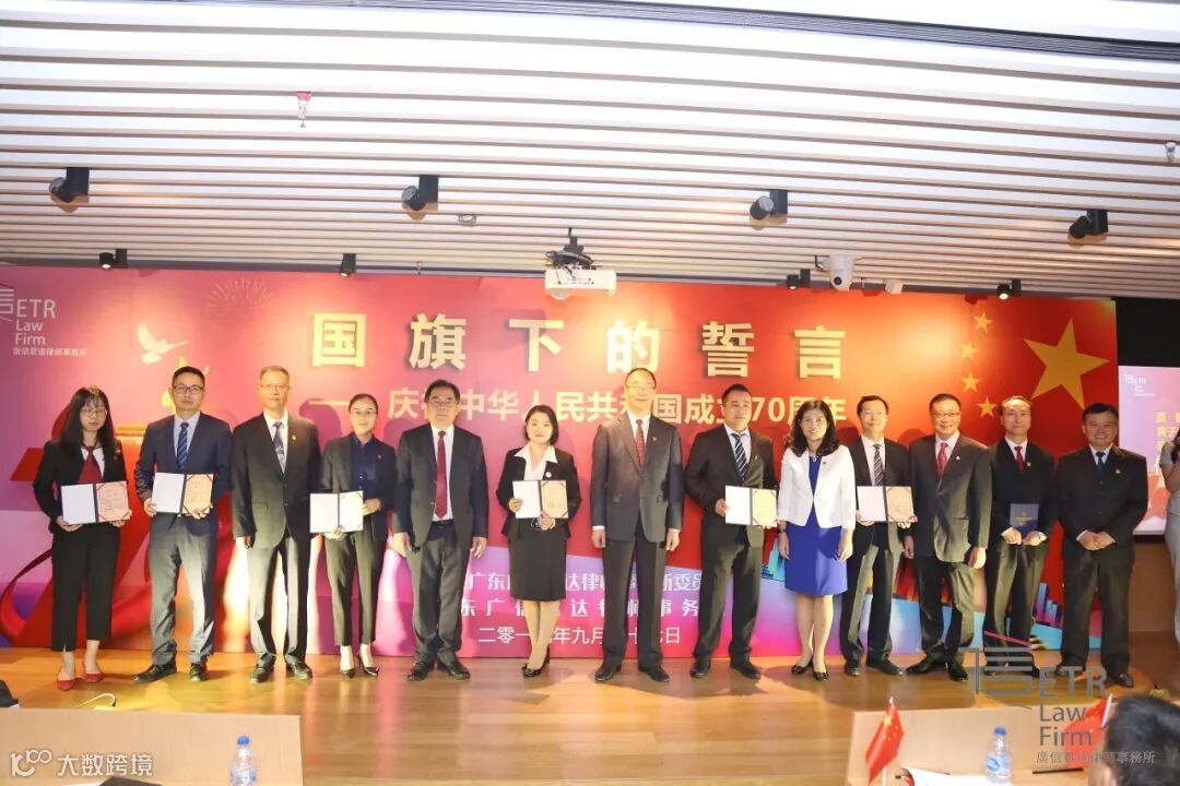 在中华人民共和国成立70周年之际,中共广东广信君达律师事务所委员会、广东广信君达律师事务所举办的“国旗下的誓言——庆祝中华人民共和国成立70周年”大会于2019年9月27日下午在广州周大福金融中心8楼隆重举行。为表彰先进,弘扬正气,激励全所员工恪尽职守、再创佳绩,经中共广东广信君达律师事务所党委、广东广信君达律师事务所研究决定,对勤于进取、精于业务、甘于奉献且执业满20年的律师和自律所合并以来仍在职的律师及员工予以表彰,向王超莹等45名执业律师授予“律师执业20年贡献奖”,向王文红等133名律师及员工授予“忠诚奖”。在此,对获奖的律师及员工表示热烈祝贺!
