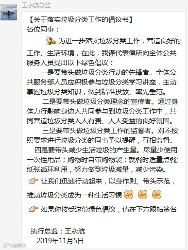 日前,公共服务部门人员积极响应《关于落实垃圾分类的倡议》,以身作则、带头示范。