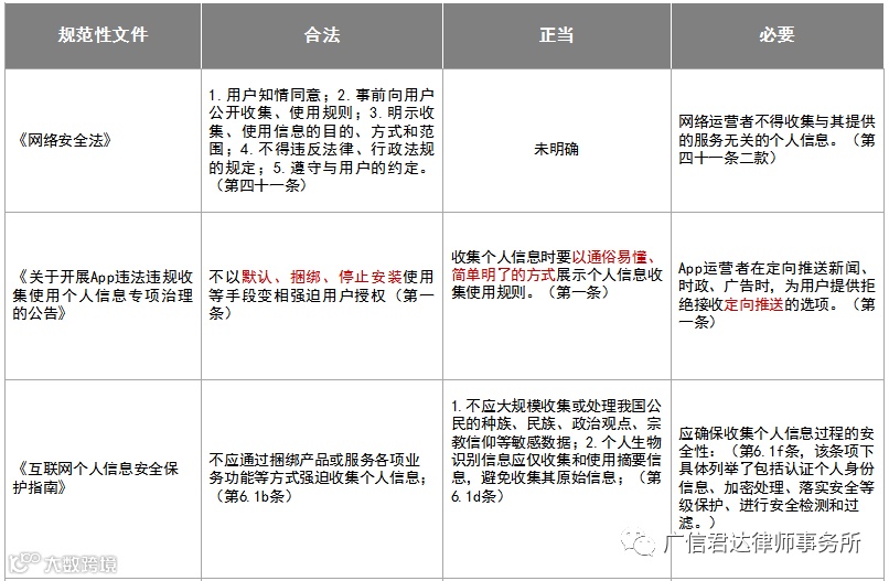 什么是收集使用个人信息应遵循的合法、正当和必要原则?其主要来源于个人隐私和个人信息保护的相关立法和研究,而个人信息,简言之即能够识别出自然人身份的有关信息,个人信息概念,见同在2017年6月1日生效的《网络安全法》七十六条和《最高人民法院、最高人民检察院关于办理侵犯公民个人信息刑事案件适用法律若干问题的解释》第一条,本文不作展开,也无意就合法、正当和必要原则在理论上追根溯源,本文直接根据监管层最新的规定进行梳理,供大家对照: