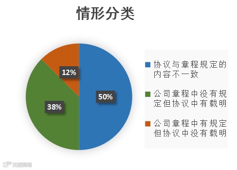 由于法律并未明确二者的效力关系,当事人之间就公司设立后股东协议能否继续适用问题产生纠纷。3.公司章程中有规定但协议中没有载明。最后这种类形纠纷相比于前面两种出现次数较少,仅有13%。