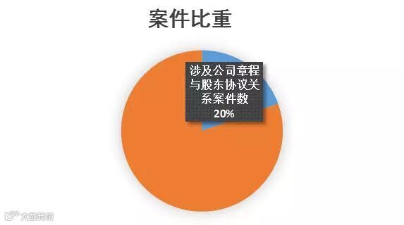 正如前文所述,由于股东协议和公司章程同时处于有效状态的情况是存在的,那么一旦股东协议与公司章程在内容上存在差异,准确地说,对于同一事项规定了不同的处理方式,纠纷随之而来。我们以2018年广东省高级人民法院审结的案件为样本,以“公司章程”为关键词搜索,涉及公司章程的裁判文书共41份,其中涉及到股东投资协议和公司章程规定差异产生的纠纷案件占比20%,具体统计情况如下图所示: