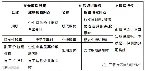 股权激励的核心在取得股权,为达到激励的目的,一般分为两种方式取得股权,一是即时取得,但处分附有条件限制,二是将来取得股权。当然还有一种不取得真正的“股权”。