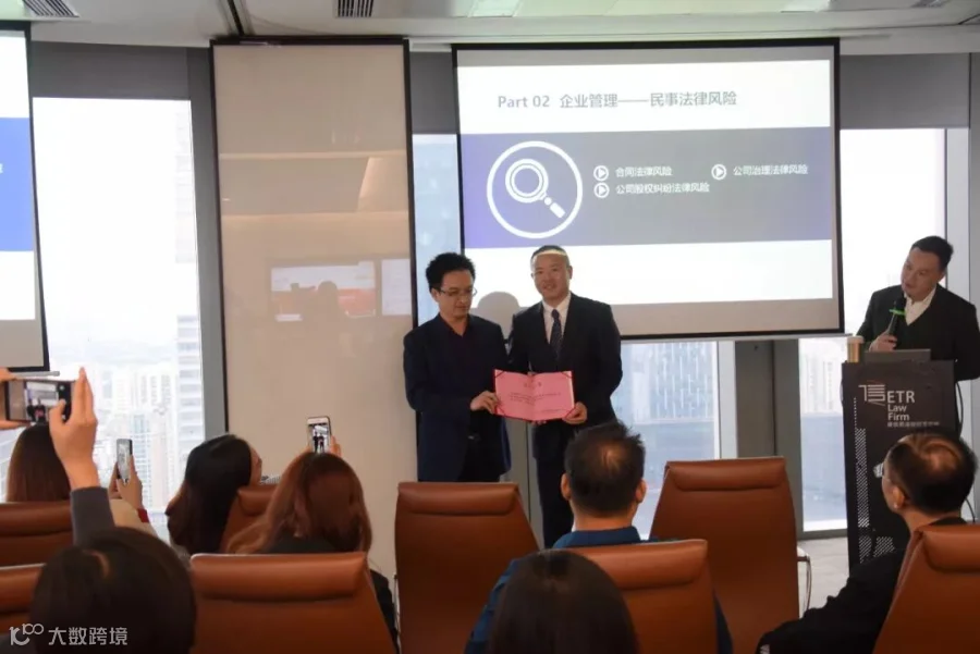 在讲座中场休息环节,广东省中小企业商务管理创新协会向蒋修贤律师授予“‘产业创新法律服务’优秀律师”证书,以表彰蒋修贤律师对广东省中小企业提供产业创新法律服务的贡献。
