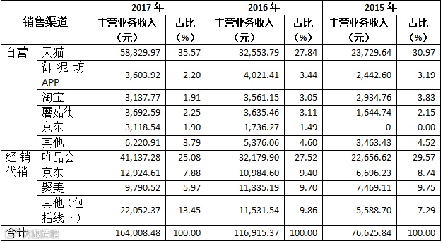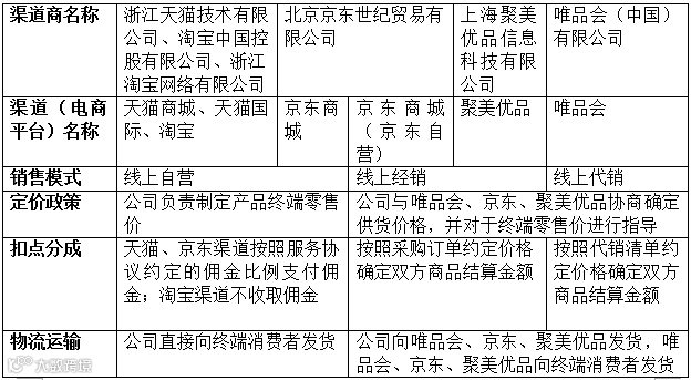 2014至2017年1-6月,天猫商城(包括天猫国际)、淘宝、唯品会、京东商城、聚美优品渠道产生的销售收入占公司主营业务收入的比重合计分别为86.26%、83.04%、78.94%和80.52%,是公司主要的渠道,报告期内,发行人通过各主要渠道商进行销售的情况如下: