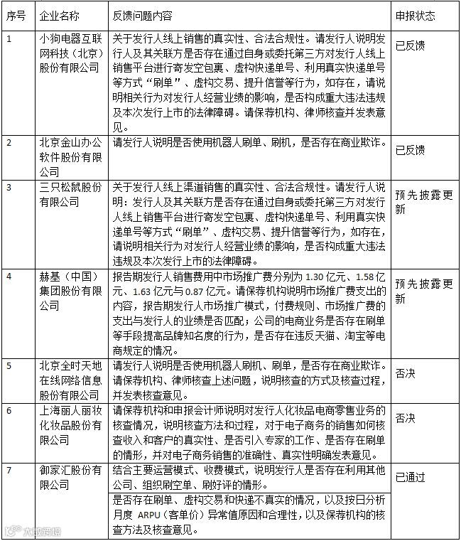 经我们检索,至今共有7家企业在申请IPO时被直接反馈问及“刷单”问题,该等企业均为以线上销售为主的企业,目前,唯一已成功过会的企业为御家汇,其对于解释其不存在“刷单”情况的解释具有一定的参考价值。