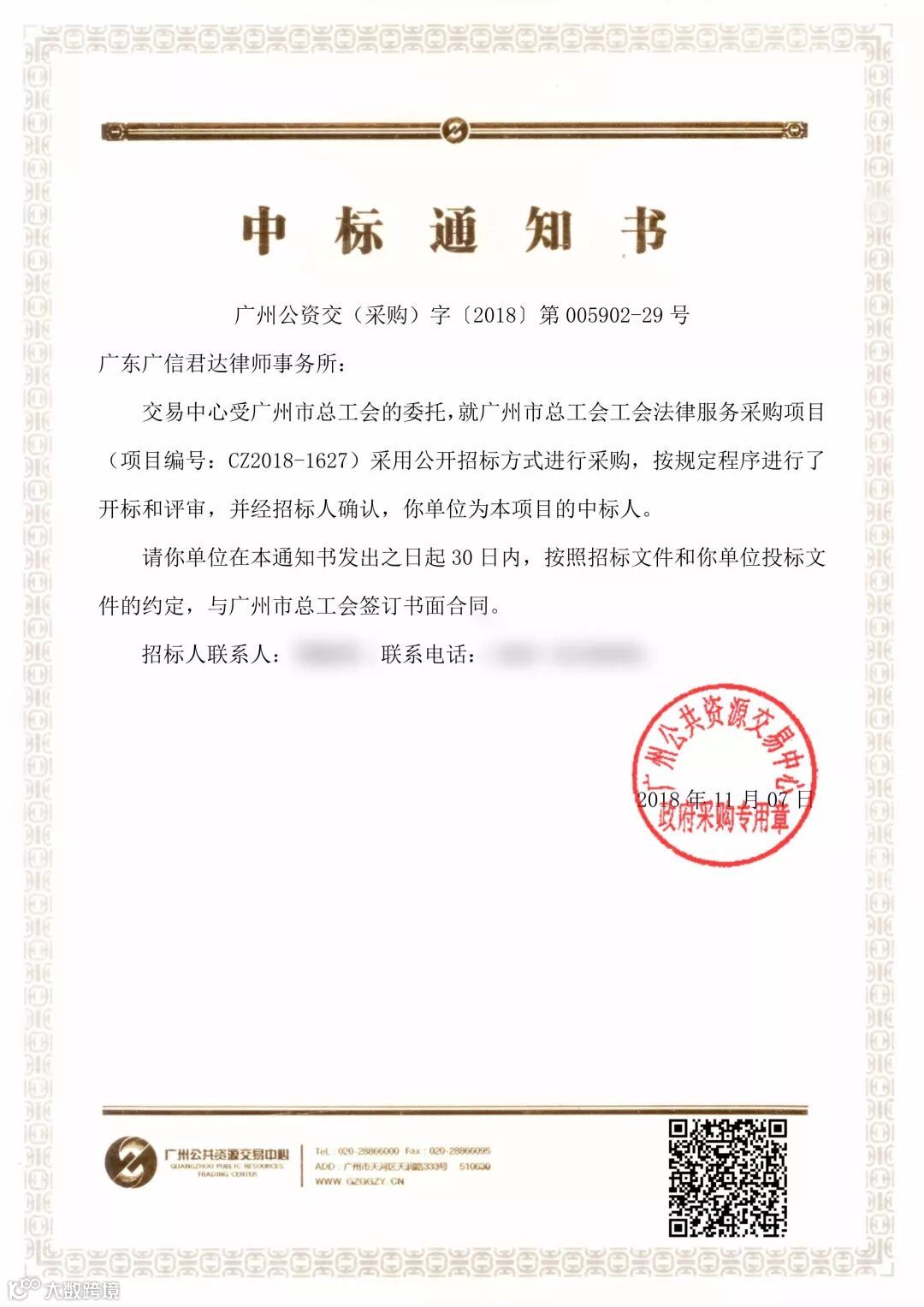 广信君达入选广州市总工会工会法律服务采购项目的中标通知书