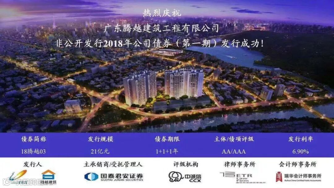 2018年12月,广东腾越建筑工程有限公司(简称“腾越建筑”)非公开发行规模为人民币21亿元的公司债券(第一期)(简称“本次债券”),票面利率为6.90%。在本项目中,广东广信君达律师事务所律师担任腾越建筑的专项法律顾问,由本所高级合伙人全朝晖、合伙人张雪芳、黄晓芸、杨尹及律师刘阳、莫欣影、实习律师邱艳玲等共同组成工作组,协助腾越建筑完成尽调法律工作,并根据证监会、上交所的要求,对项目进行法律尽职调查并出具专项法律意见书及协助起草相应交易文件。