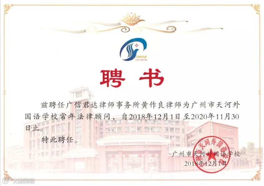 近日,广东广信君达律师事务所合伙人黄作良律师受聘为广州市天河外国语学校的法律顾问。