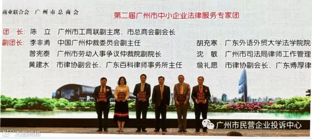 第二届广州市中小企业法律服务专家团由市工商联牵头,联合市司法局、市工信委、市人社局、市工商局、中国广州仲裁委、市律师协会共同组建。专家团由市工商联副主席陈立任团长、中国广州仲裁委副主任李非淆、广东外语外贸大学法学院院长胡充寒、市劳动人事争议仲裁院副院长曾宪泰、市司法局律师工作管理处处长沈敏、市律师协会副会长黄建水,市律师协会副会长詹礼愿任副团长,以及法律行业专家共52人组成。广东广信君达律师事务所专职律师朱滔被聘为法律服务专家团专家成员。