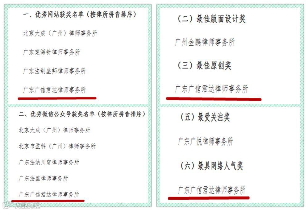 2018年2月22日,“广州市律师事务所优秀宣传平台(优秀网站、优秀微信公众号)评选”获奖名单出炉。其中,广东广信君达律师事务所荣获“优秀网站”、“优秀微信公众号”两项大奖以及“最佳原创奖”(网站)、“最具网络人气奖”(微信公众号)两项单项奖。