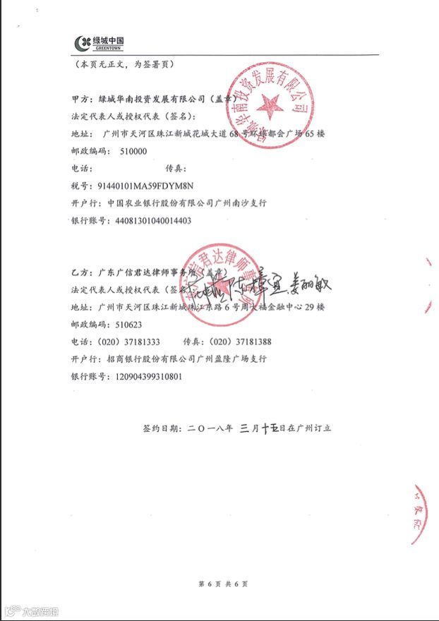 2018年3月15日,绿城华南投资发展有限公司与广信君达正式签订常年法律顾问服务合同。